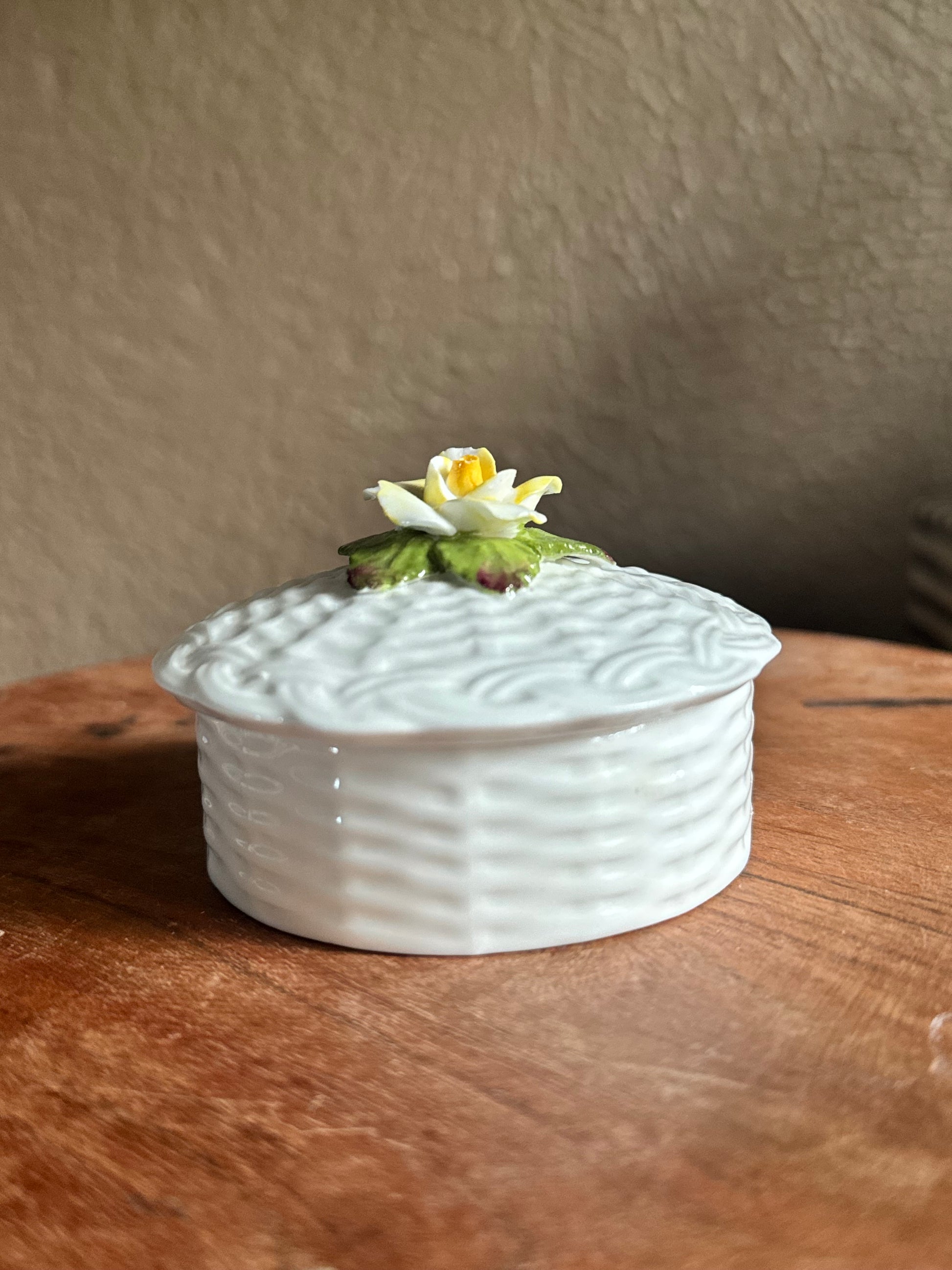 Aynsley England Fine Bone China Trinket Box with a dainty raised pale yellow flower on lid.