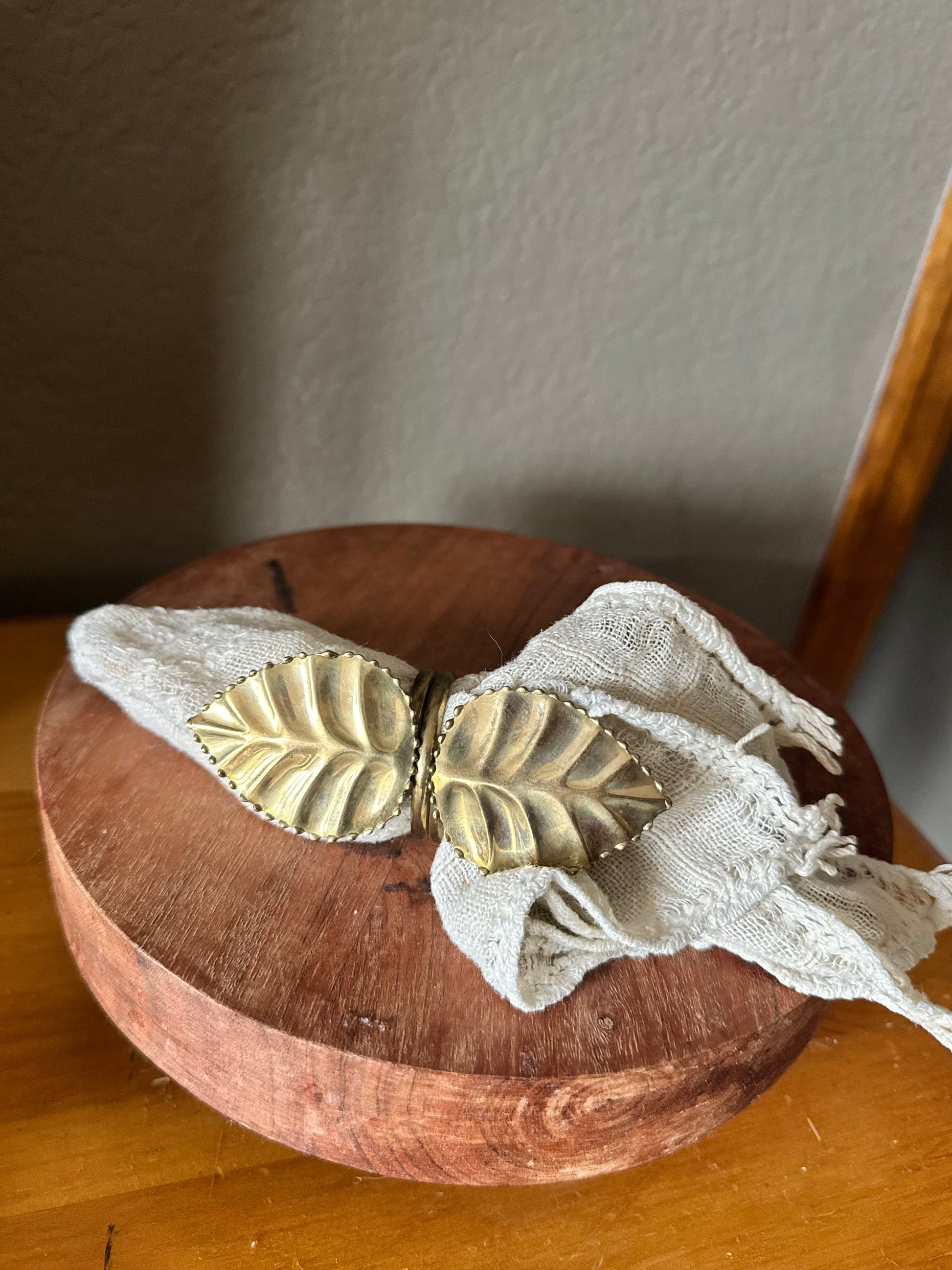 Set of six brass napkin rings. Beautiful Leaf design. Great for those holiday parties. Very Unique. (Napkin pictured not included). 4”