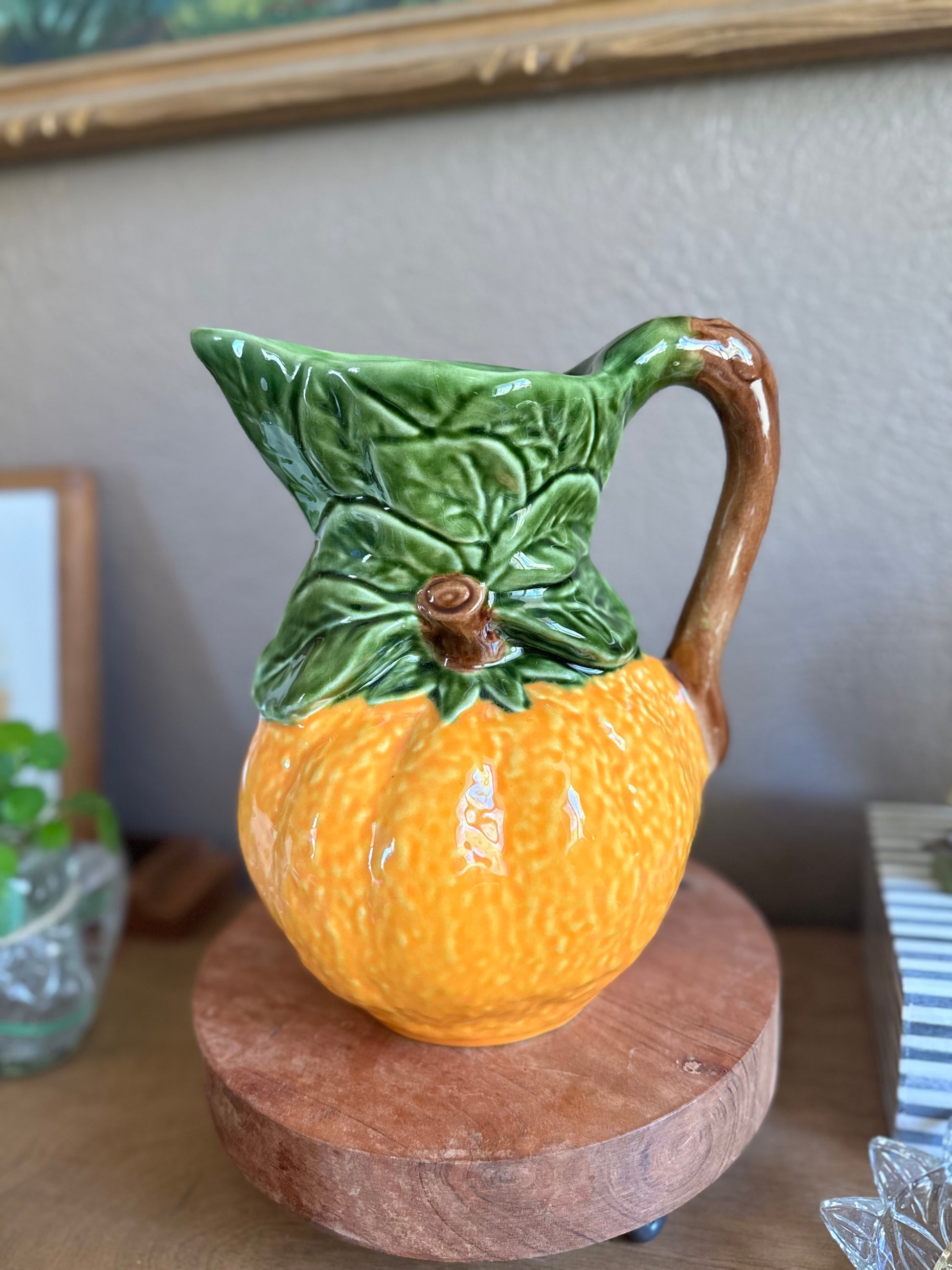 The item is a vintage majolica pottery pitcher from Olfaire, a brand from Portugal. This textured ceramic pitcher has an orange fruit-shaped body, green leaves at the top, and a brown branch-like handle. The pottery is handmade and hand-painted. Olfaire also produces other majolica pottery pieces in various fruit and vegetable designs, such as grapes, lemons, pumpkins, and cabbage leaves.