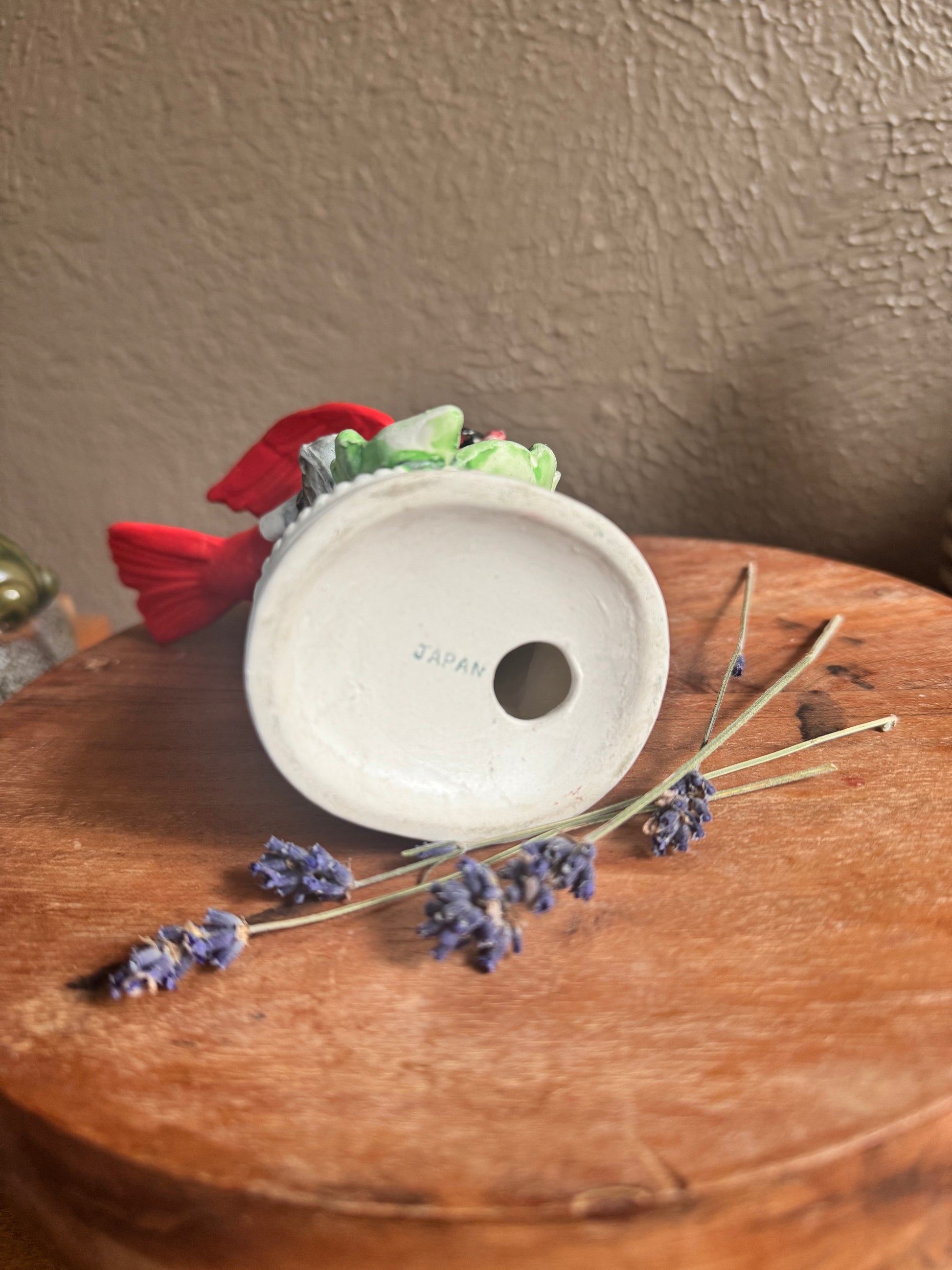 This vintage red cardinal bird figurine is a charming collectible piece made of porcelain. Standing at 5 inches tall, the figurine depicts a cardinal perched on a tree branch, adding a touch of nostalgia and elegance to any collection. The finely crafted details capture the beauty and grace of this iconic bird species, making it a unique and sought-after decorative item for bird enthusiasts and collectors alike.