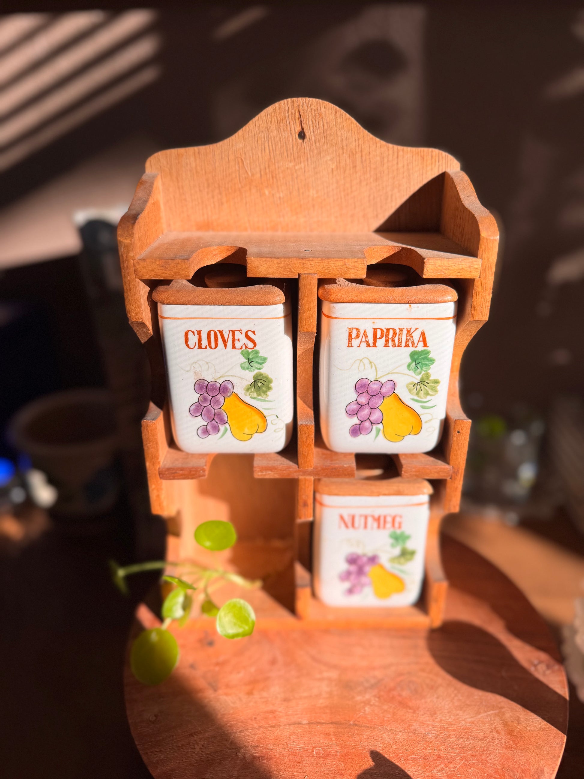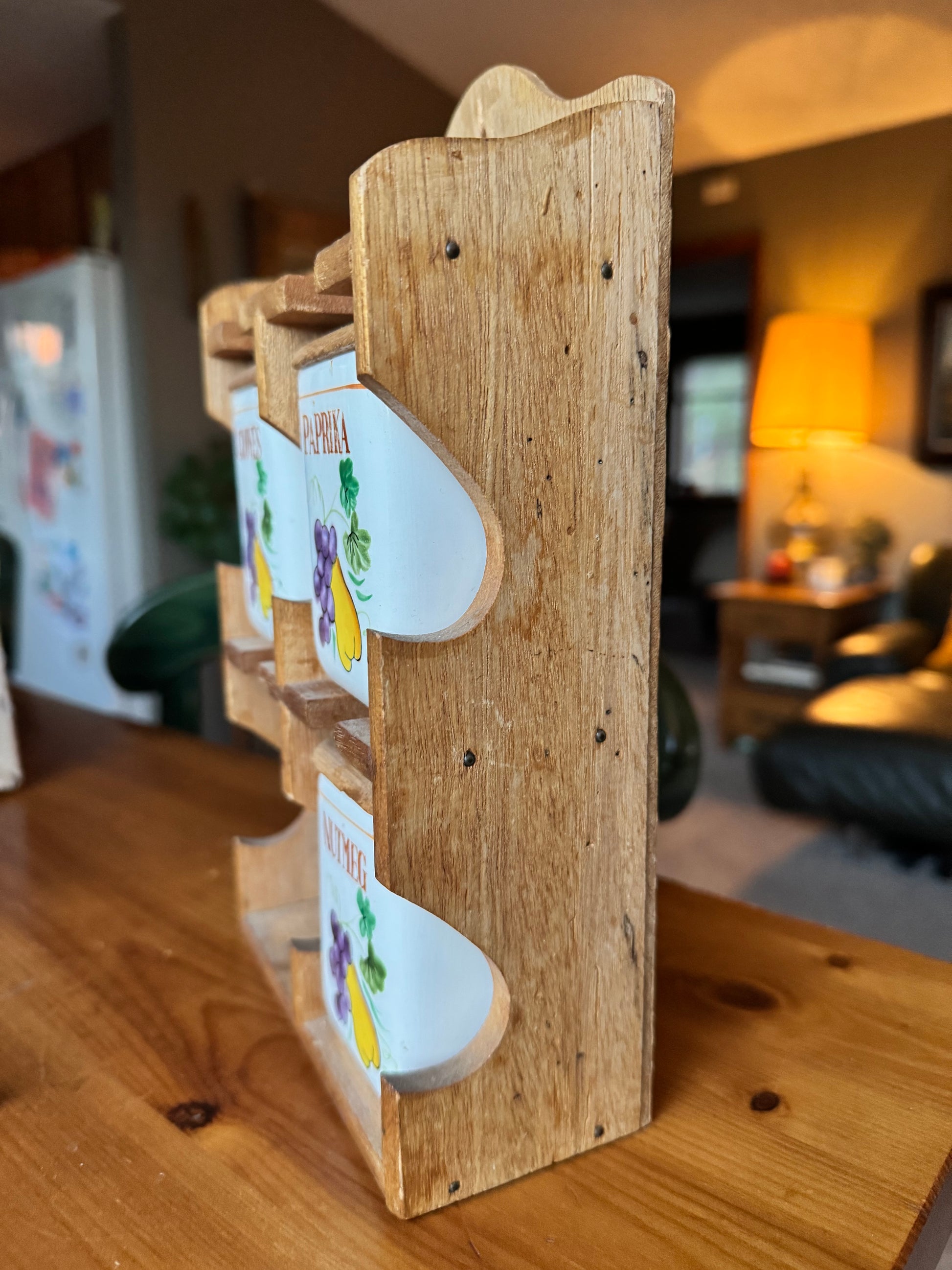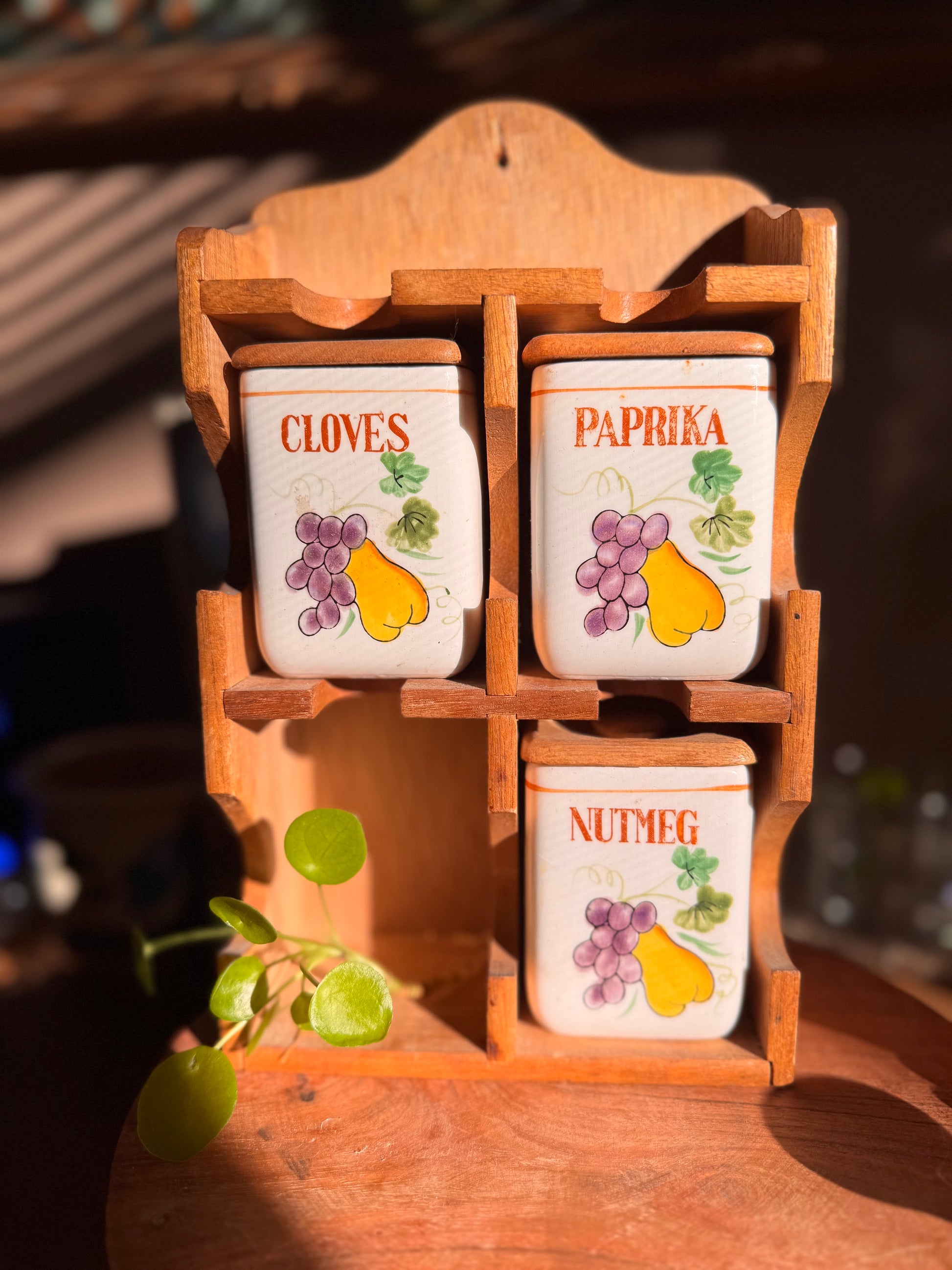 Vintage Wooden Spice Shelf with Ceramic Canisters and Wooden Lids. Missing one spice canister.